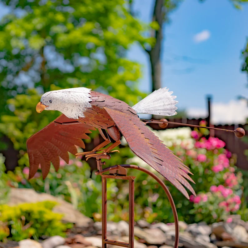 The kinetic Jumbo Rocker Eagle in Flight Garden Stake is a great decoration for your lawn or garden. Our Eagle in Flight sits on top of a stake secured with a bolt for stability, When the wind blows, it rocks back and forth and the wings slowly flap up and down as if the bird is in flight. The pieces are well weighted with a large solid metal balance ball under the bird and with a 4 prong double U stake to keep this securely on the ground. It's an overall very unique and well made piece. Some assembly required. Our Jumbo Rocker Eagle in Flight Garden Stake looks absolutely stunning displayed outdoors in your yard or garden landscape. Truly a work of art!