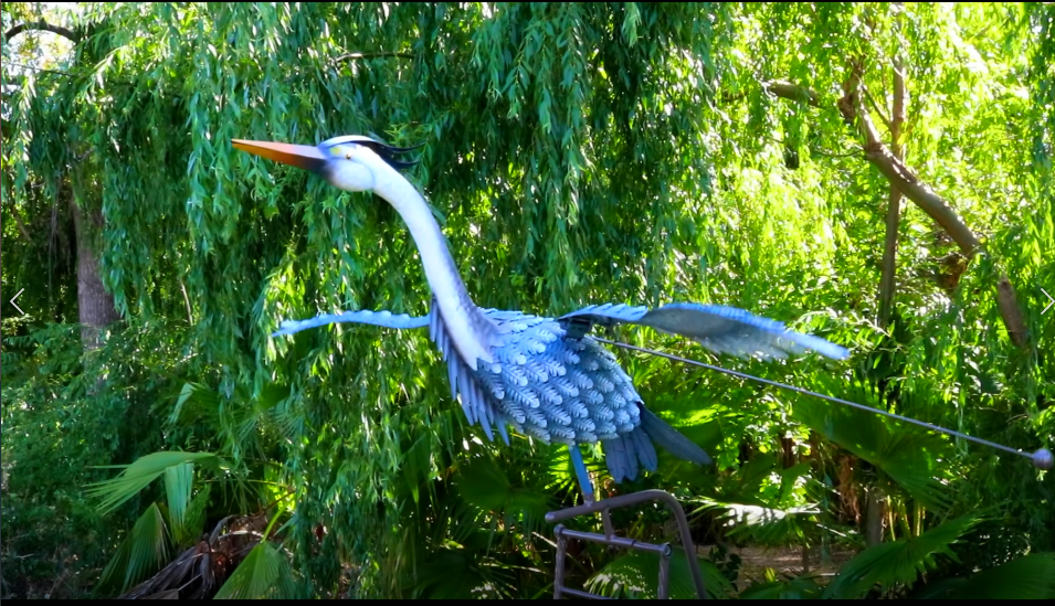 Regal's popular metallic Crane-in-flight sits on top of a stake secured with a bolt for stability. When the wind blows, it rocks back and forth with the wings slowly flapping up and down as if the bird is in flight