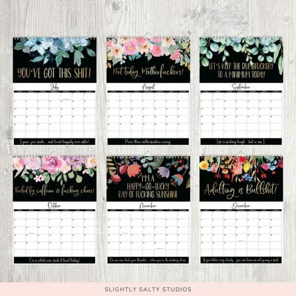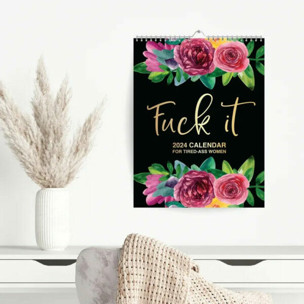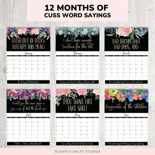 This cuss word 2024 Wall Hanging Calendar features TWO funny cuss word quotes per month for the year of 2024. This hanging wall calendar features a hook to hang on the wall, is vertical and sized 11″ x 8.5″.