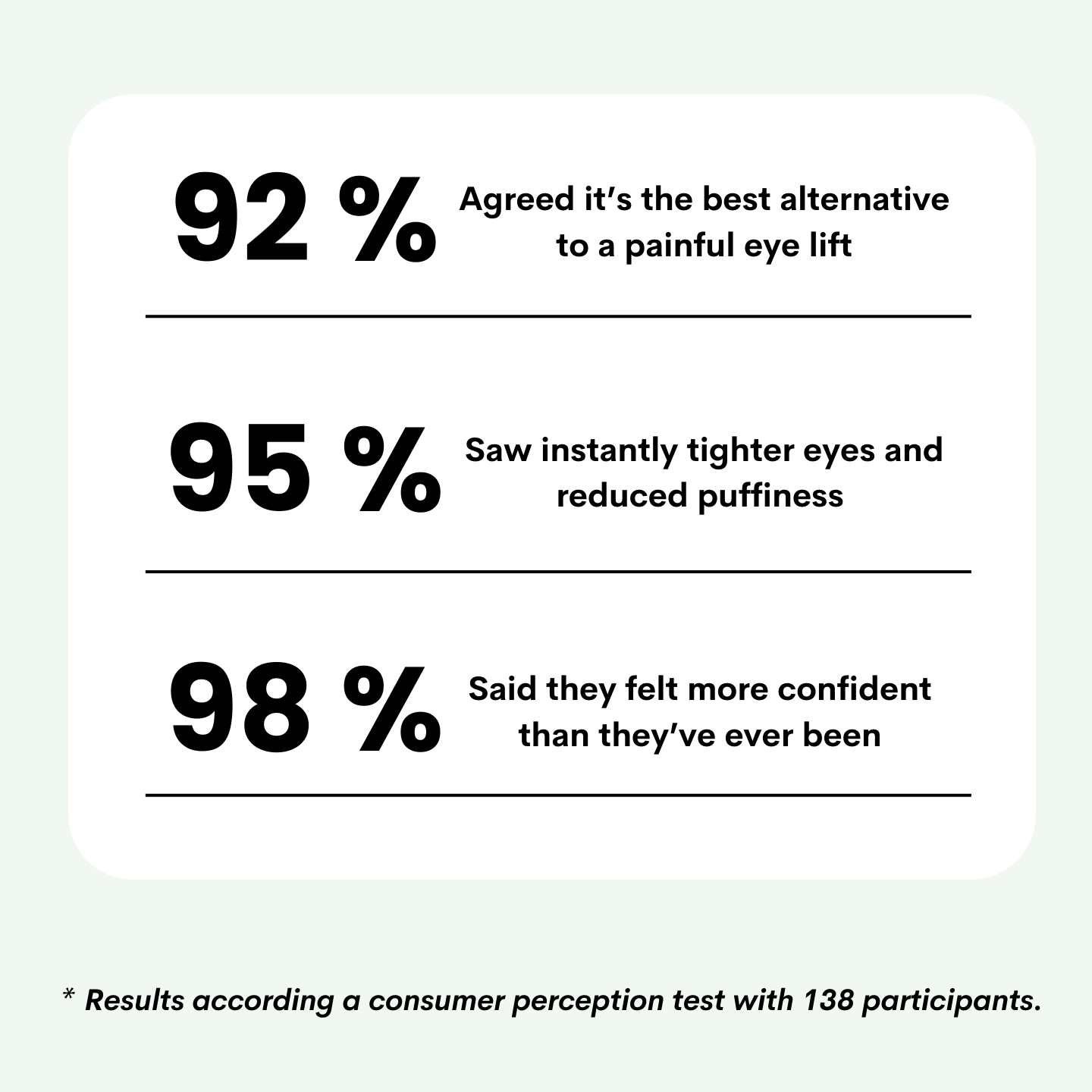 The result is instant and lasts up to 8 hours. In addition, from now on you can enjoy the comfort of being able to lift give yourself an eye lift at any time, comfortably and easily from home.