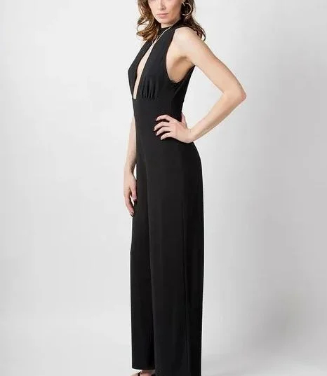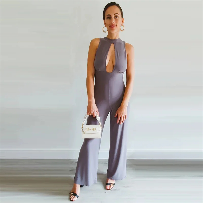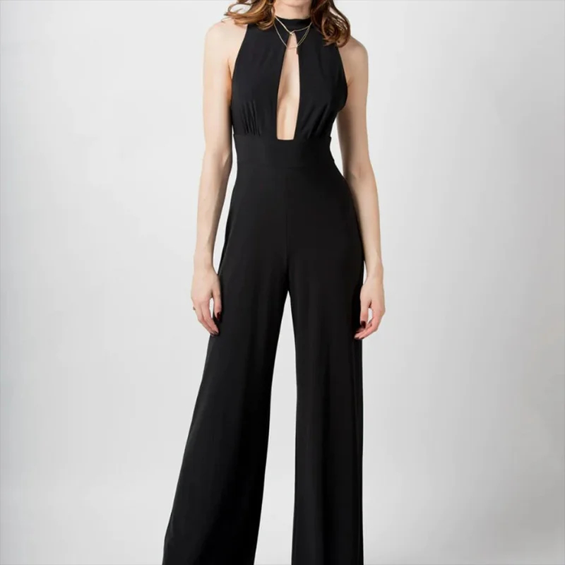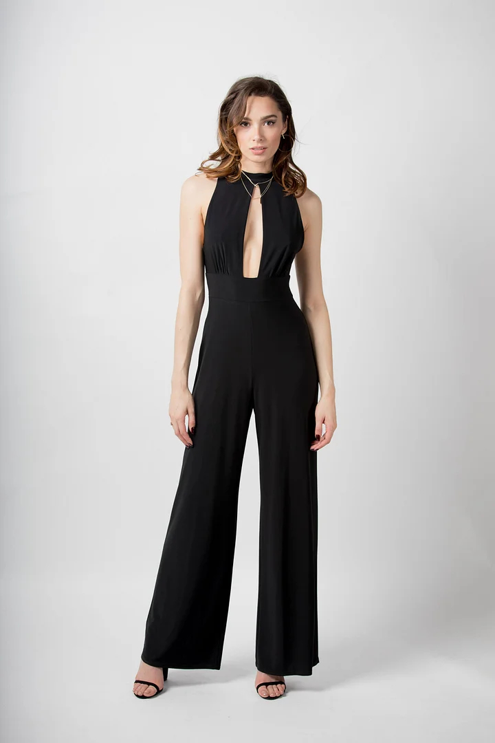 The wide leg black jumpsuit is a must for your wardrobe! Trust us. This sleek style features a high-neck choker design with a two button enclosure on the back. Front cutout design shows sexiness. Team it with a bright lip and nude heels for a major fashion statement.