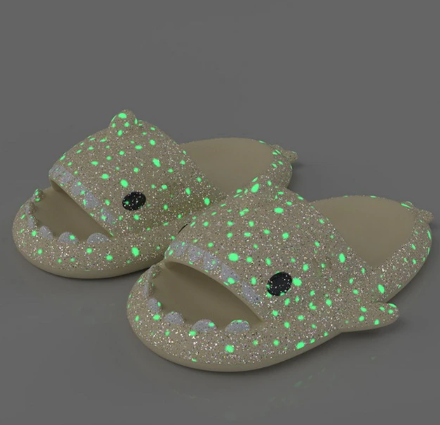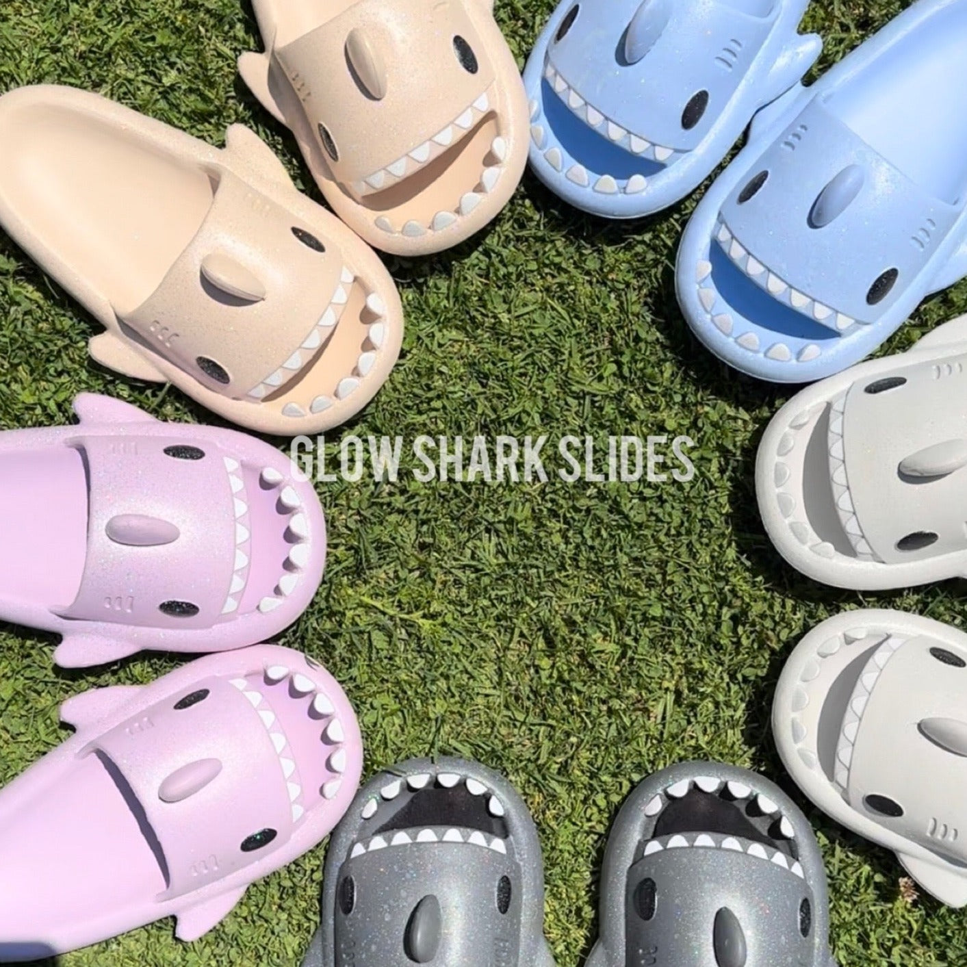 Get ready to glow with the ultimate summer accessory! Our Glow in the Dark Glitter Slides will help you unleash your inner shark, and stand out from the crowd. With a comfortable fit and eye-catching design, these slides are perfect for any occasion.