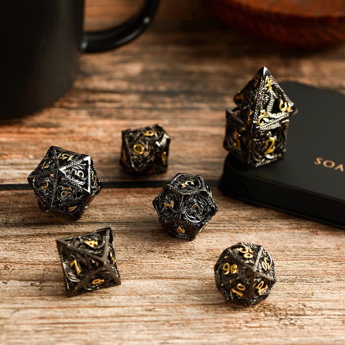 Hollowed metal dice set with the flying dragon. Perfect items for your dnd table game 🐲