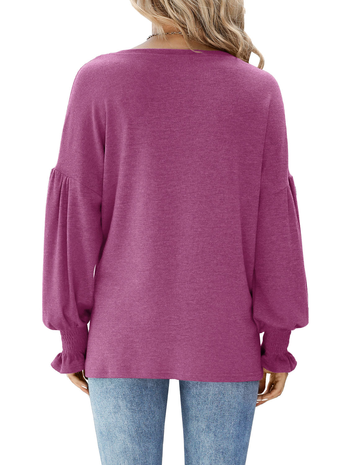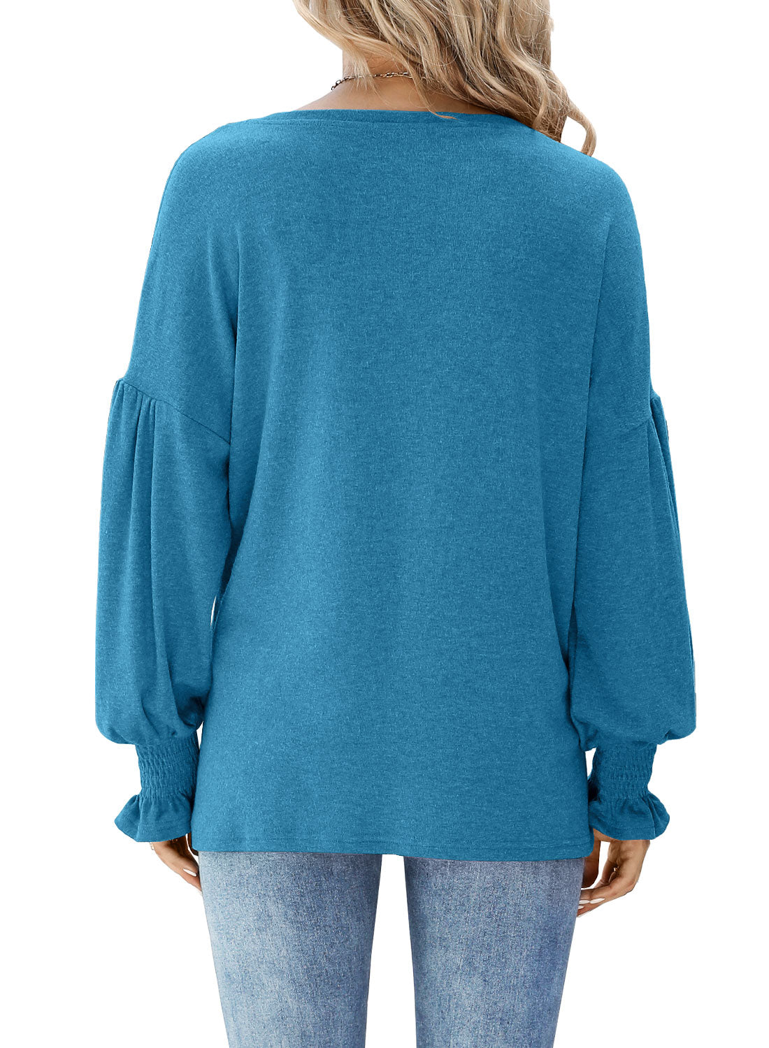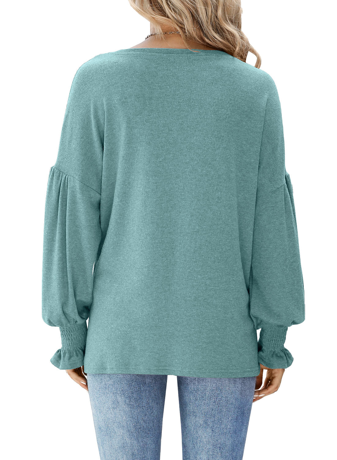 • This women's blouse features a trendy lantern sleeve. The flares cuffs add the perfect finishing touch. It makes this shirt so cute and fun!