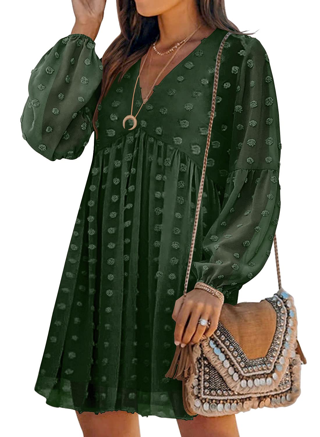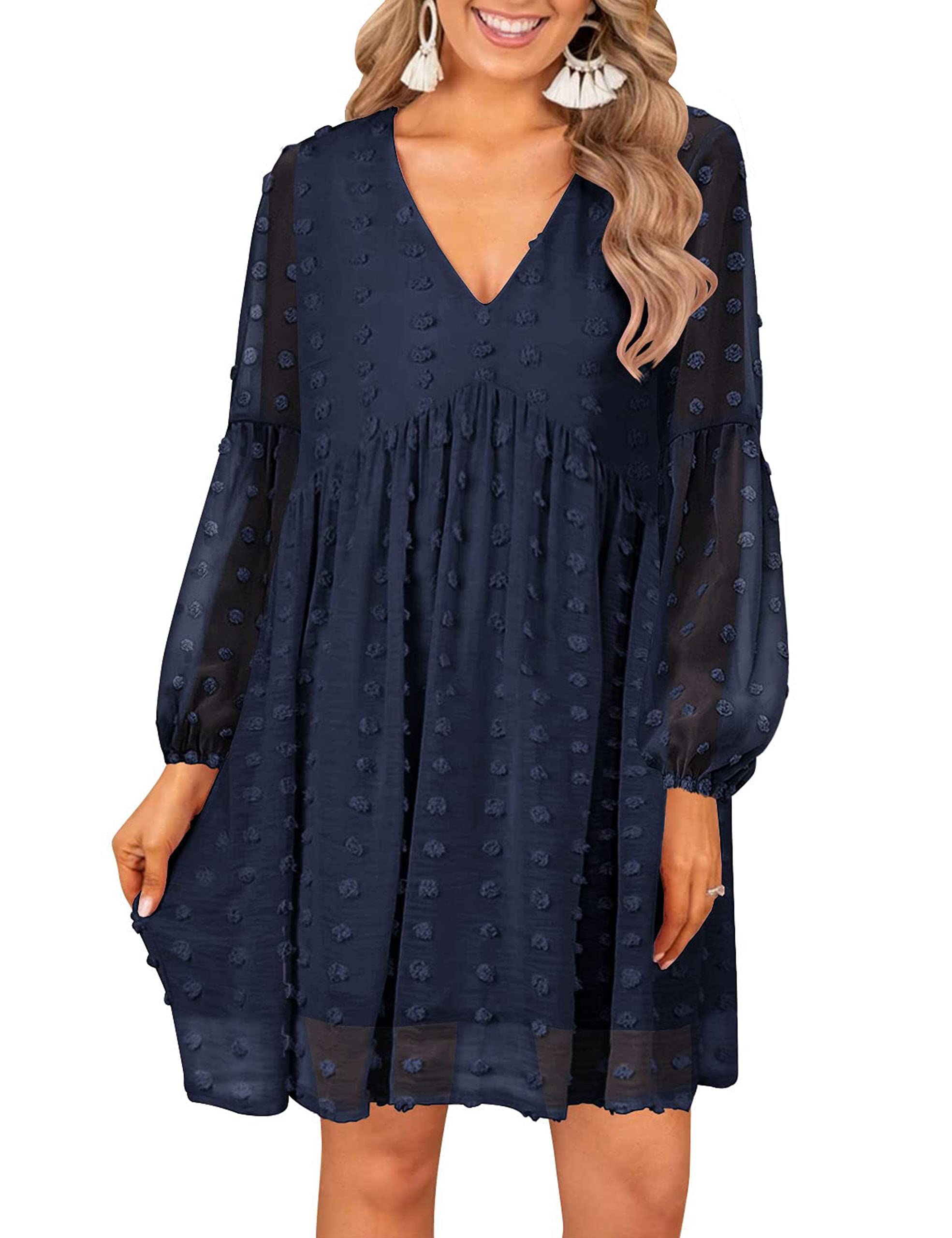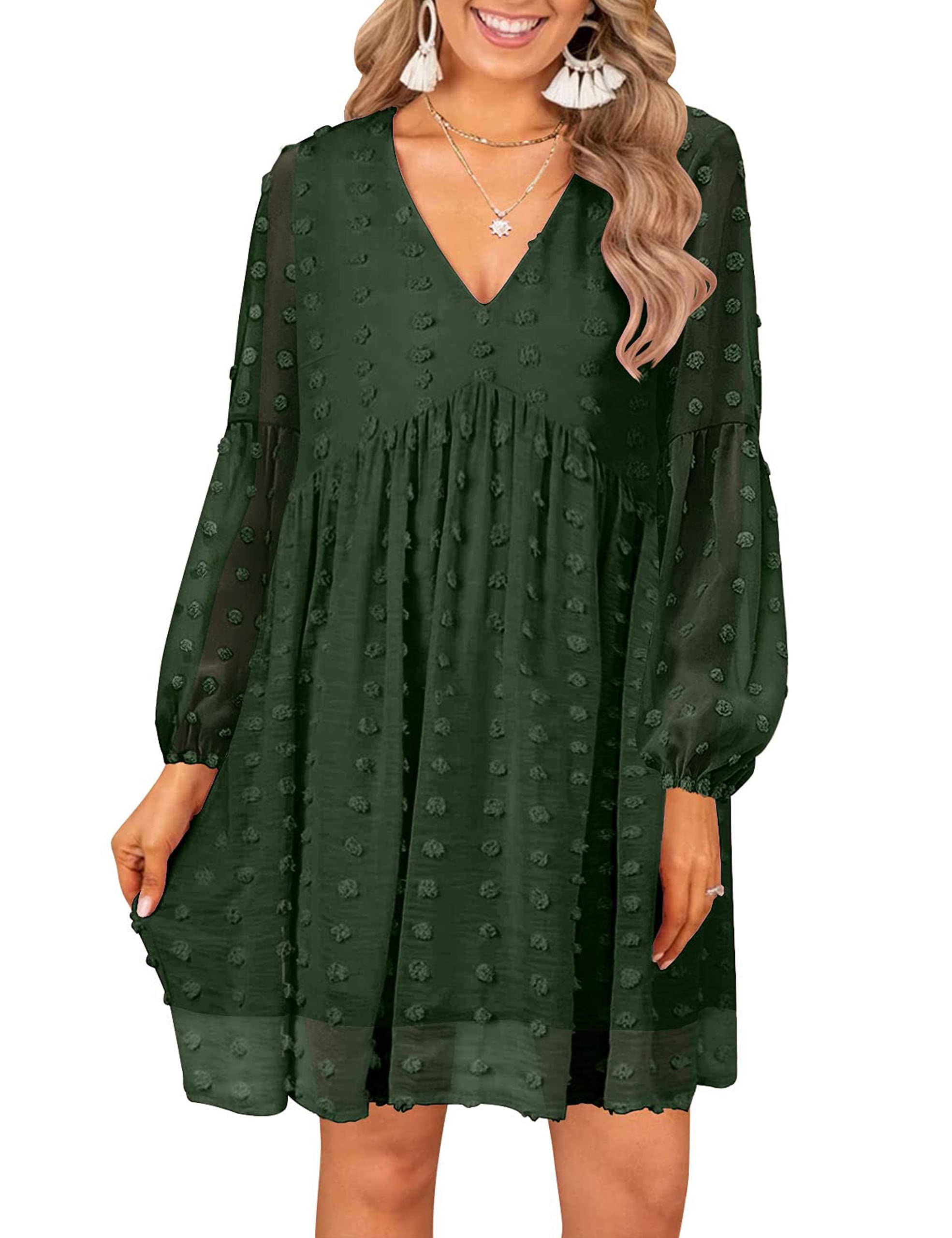 • Split V Neck, Short Sleeve Dresses for Women, Cute Swiss Dot, Ruffle, and Babydoll Dress With Pockets