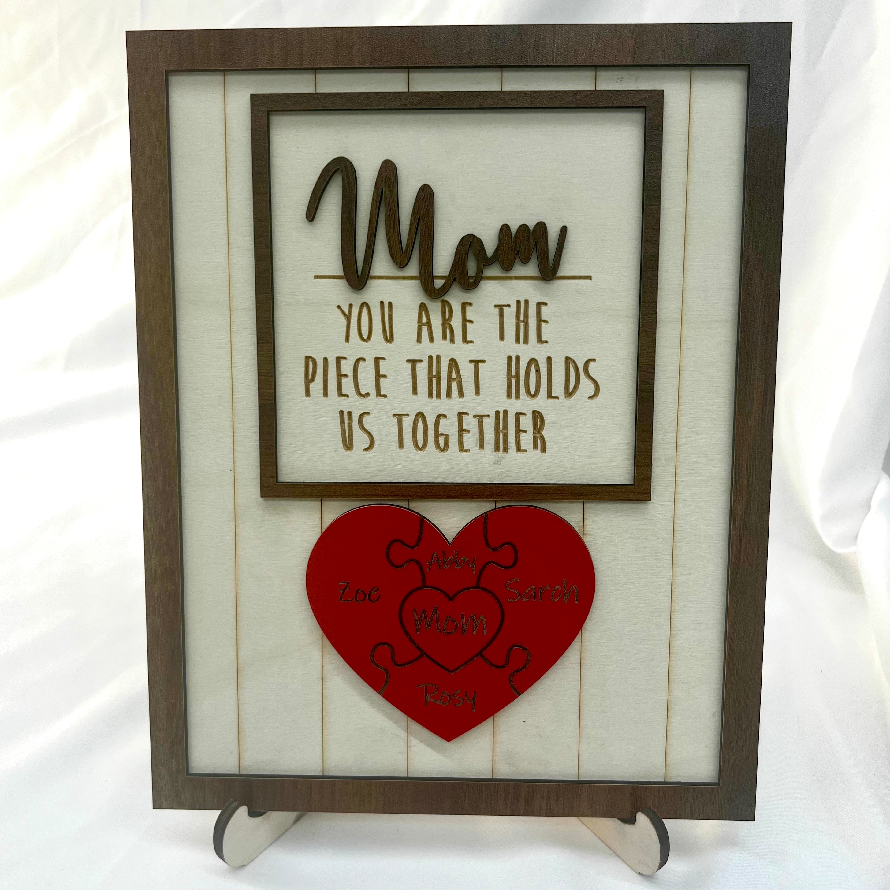 Mom is like a puzzle piece in the middle. firmly connecting the family together. customize this custom wood name puzzle sign gift. engrave the names of family members on the puzzle. and give it to Mom as a gift. (Up to 6 small puzzle pieces can be customized)