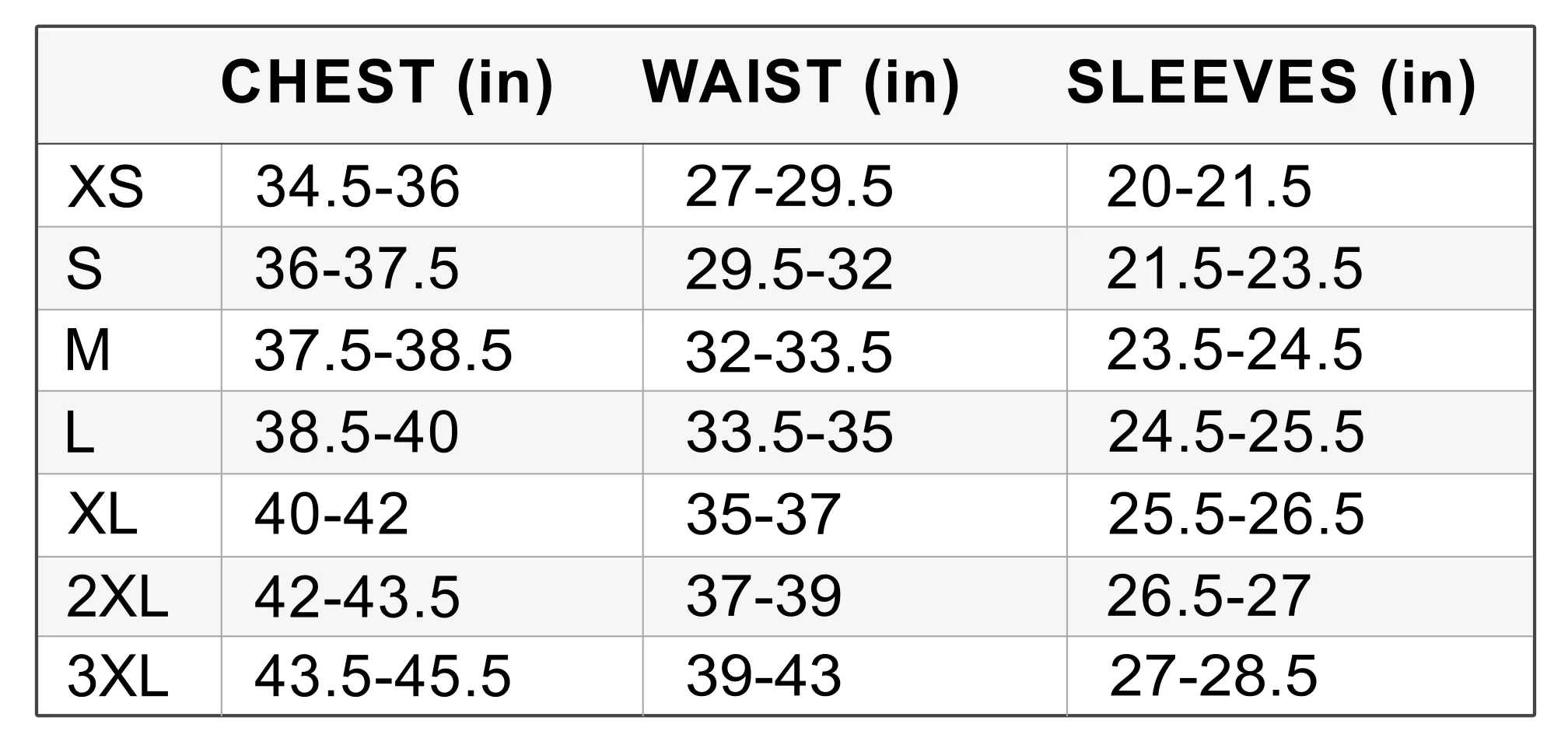 Note: Jackets are snug fit - if you prefer a looser fitting jacket order a size up